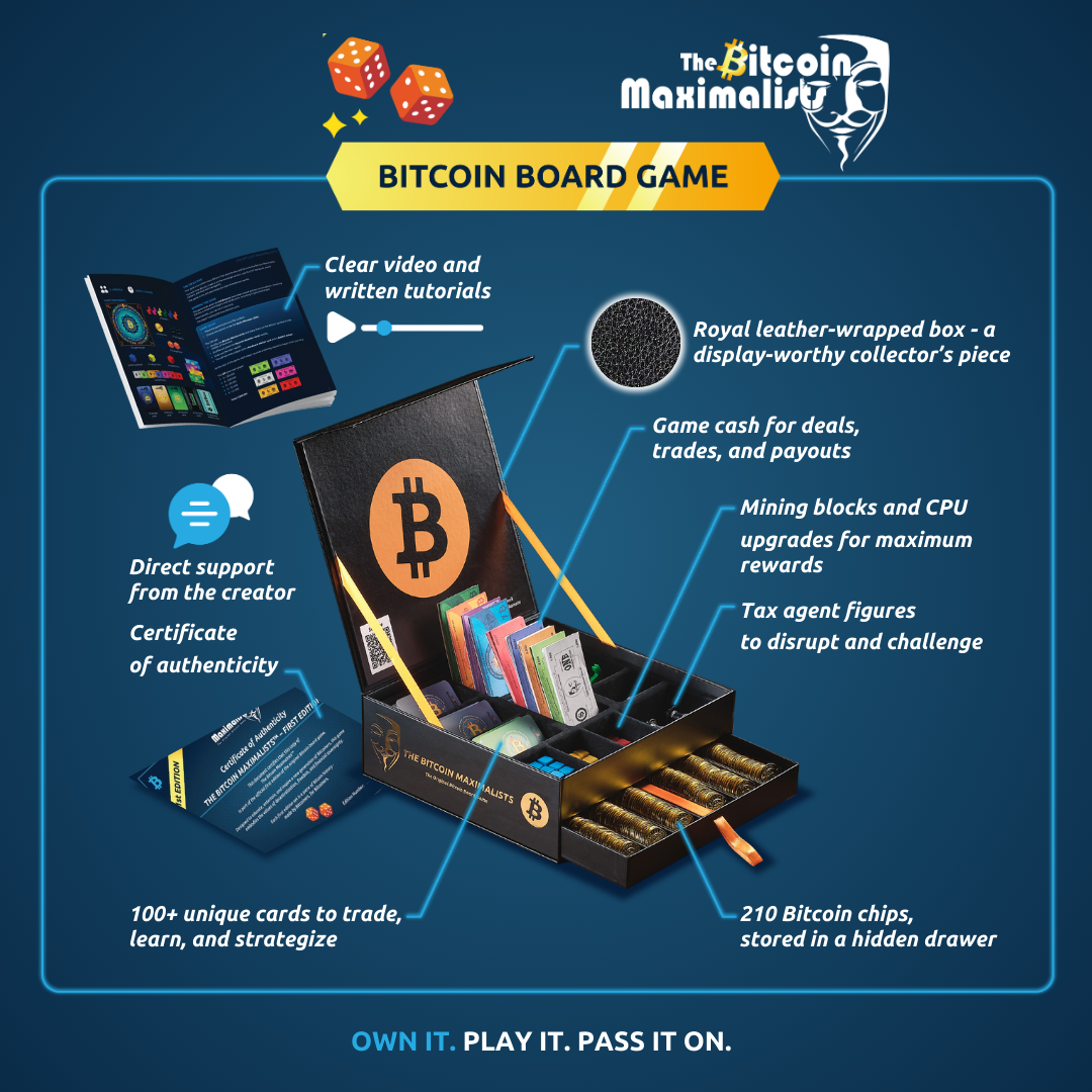 The Bitcoin Maximalists is the ultimate Bitcoin board game that blends learning, strategy, and fun - perfect for crypto fans and board game lovers alike.